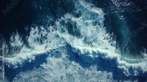 Z lotu ptaka widzimy ocean pełen życia, gdzie każda fala rozbija się o brzeg, tworząc szereg białych smug piany.