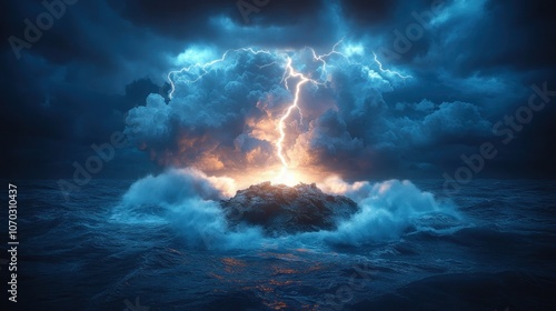 A single, powerful lightning bolt strikes a small island in the middle of a stormy sea.