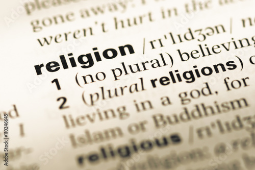 Close up of old English dictionary page with word religion