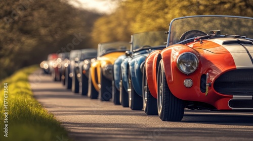 Colorful classic cars line the road in a vintage car rally during a sunny afternoon