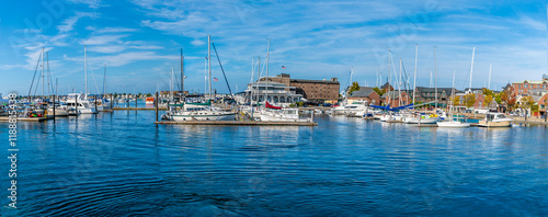 A panorama view of boats moored in the marina at Newport, USA in the fall