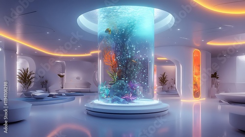 A cylindrical vertical aquarium with cascading bubbles and vibrant aquatic plants, housing exotic fish, placed in a sleek futuristic lounge with reflective glass accents and soft neon hues.