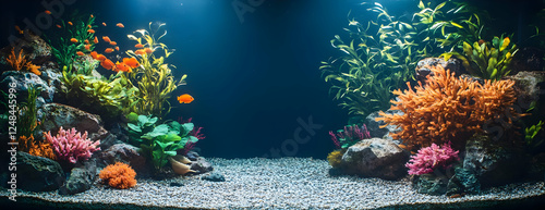 Vibrant fish tank, aquatic plants, rocks