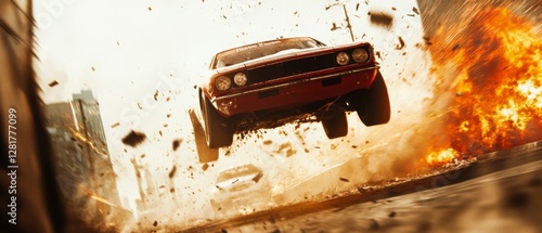 A classic muscle car soars ahead amidst an urban explosion, embodying speed, adrenaline, and the thrill of a high-octane chase.