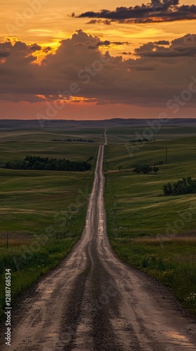 Gravel road stretching through lush green rolling hills under dramatic sunset sky. Tranquil rural landscape and journey concept