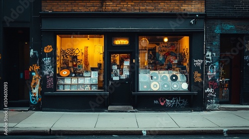 Urban Record Store Front with Graffiti Art at Night