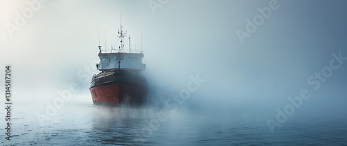 Statek we mgle płynący przez spokojne morze – tajemniczy i nastrojowy morski krajobraz o poranku