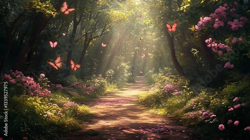 Sunlit path through enchanted forest, pink blossoms, butterflies; fantasy backdrop
