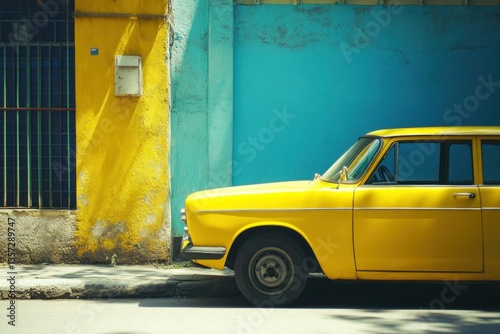 Bright yellow vintage car parked against a colorful urban wall, showcasing retro style and vibrant city life, perfect for travel and automotive enthusiasts