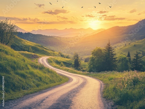 Winding road through green hills at sunset, birds flying, scenic view, idyllic landscape, golden hour light, mountain range