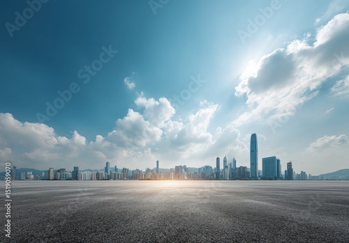 Empty asphalt road with sunlight reflection and Hong Kong skyline in background, offering a panoramic view of urban landscape and modern architecture