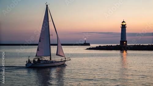 A picturesque scene at dusk featuring a sailboat gracefully entering or leaving a harbor, with a prominent lighthouse beacon shining brightly on the breakwater, under a soft, colorful sunset sky