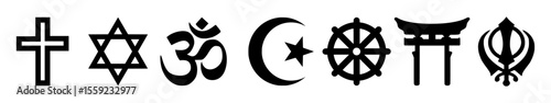 Set vector icons featuring symbols of major world religions including Christianity, Judaism, Hinduism, Islam, Buddhism, Shintoism, and Sikhism. Clean design on white background.