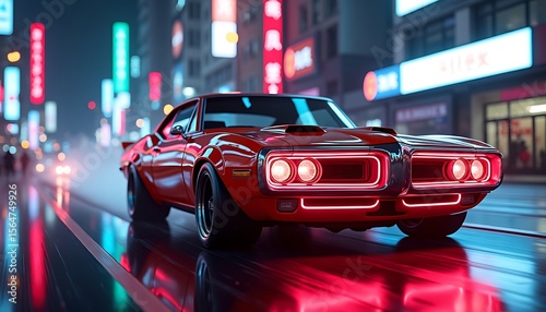 A vibrant red classic muscle car with neon lights drives through a rain-slicked city street at night, showcasing a blend of retro and futuristic aesthetics in a dynamic composition.