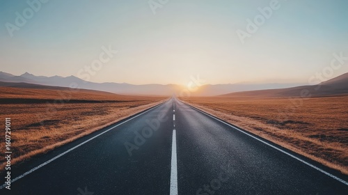 An empty road with a yellow line stretches to a vanishing point on the horizon through a vast, arid landscape under a dramatic, cloudy sky, evoking a sense of journey and solitude