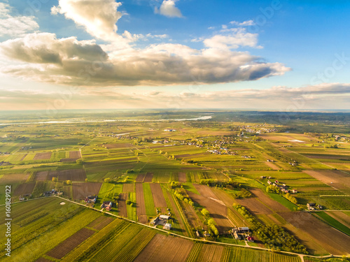 Krajobraz wiejski z lotu ptaka, w świetle zachodzącego słońca.
