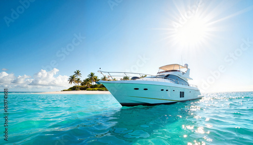 Yacht trip on clear turquoise water with exotic island background, yacht trip providing a relaxing getaway. Enjoy yacht trip on clear water