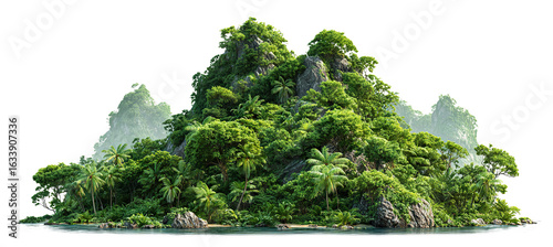 Tropical jungle island with dense green vegetation, isolated on transparent cutout background