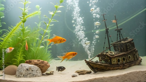 Vibrant goldfish swim gracefully through a sunlit aquarium with a sunken shipwreck decoration