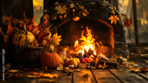 A cozy fireplace with flames surrounded by autumn leaves and pumpkins.