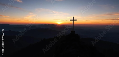 Breathtaking sunset panorama, black silhouette of mountains, forest, cross atop summit Religious grief landscape, faith, christianity