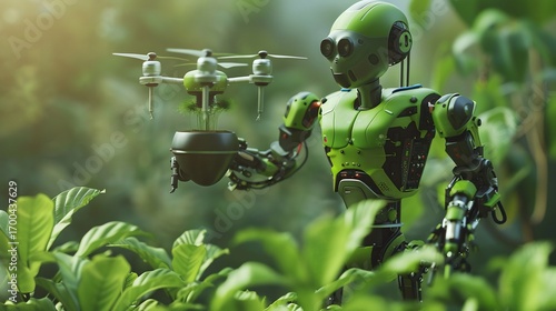 The future of horticulture showcasing an android with drone aiding plant care in lush greenery