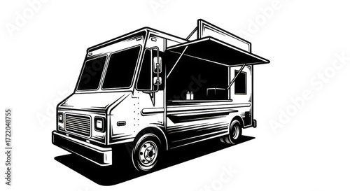 Detailed Monochrome Food Truck Illustration on Transparent Backdrop, Perfect for Culinary Business Branding and Street Food Promotion, Showcasing Mobile Kitchen Design