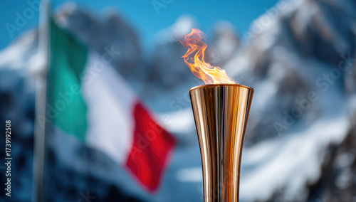 Olympic torch flame burning against italian flag and snowy mountains for milan cortina 2026 winter games