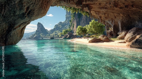 Hidden Tropical Paradise - Secluded Cave Opening to Pristine Beach, Turquoise Waters, and Towering Limestone Karsts.