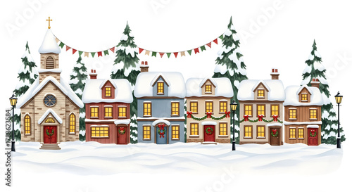 Charming winter village scene with a church, houses, snowcovered ground, and evergreen trees, decorated for the holidays
