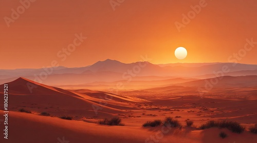 Vibrant orange and red sand dunes in golden sunset light desert landscape background with dramatic sky and soft shadows travel nature concept