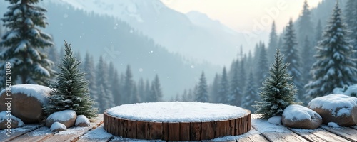 Wooden podium covered in fresh white snow on rustic plank surface. Small evergreen pine trees stand around snow-dusted rocks. Distant snowy mountains, forest create serene winter backdrop. Great for