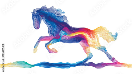 Kolorowy koń w ruchu, artystyczna ilustracja z tęczowymi smugami na białym tle, przezroczysty efekt.