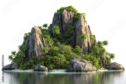 Lush tropical island mountain with palm trees and rocky shore in clear water cliff