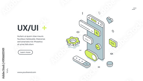 UX UI design web banner. Isometric template for a landing page on user experience. Vector illustration with a smartphone and interface elements for app development and prototyping