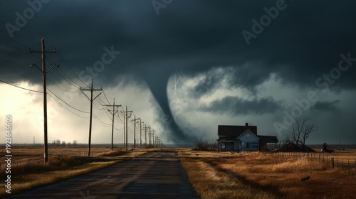 Large tornado approaching abandoned house and road with power lines in rural landscape. Natural disaster and severe weather concept.