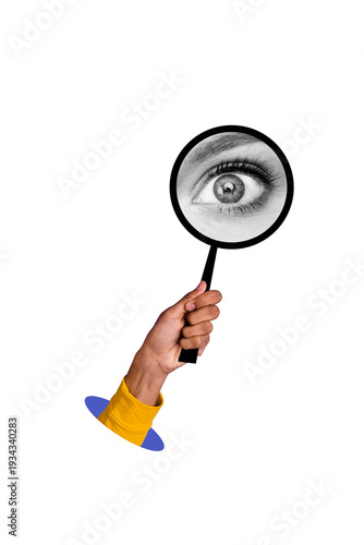 Vertical poster collage hand body fragment magnifying loop glass see watch eyeball stare examine explore drawing background