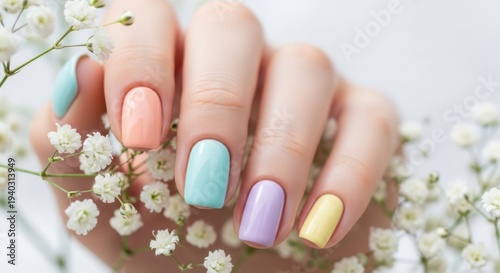 Nail Art with Pastel Colors: A manicured hand displays a colorful array of pastel nail polish hues, accented by delicate flower, embodying elegance and style.