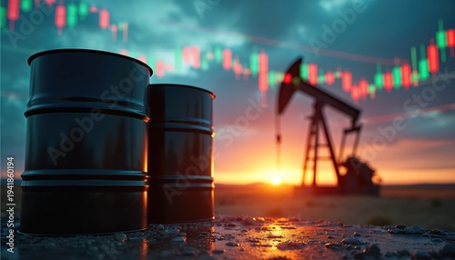 Oil barrels stand near pumpjack with stock market chart overlay at sunset. Crude oil extraction and energy trade analysis. Fossil fuel industry finance.