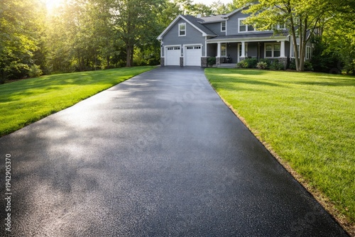 Newly paved asphalt driveway leading to modern suburban house with green lawn in sunny residential neighborhood