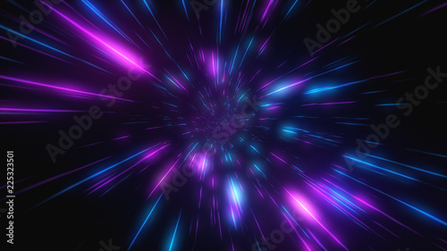 Abstract flight in retro neon hyper warp space in the tunnel 3d illustration