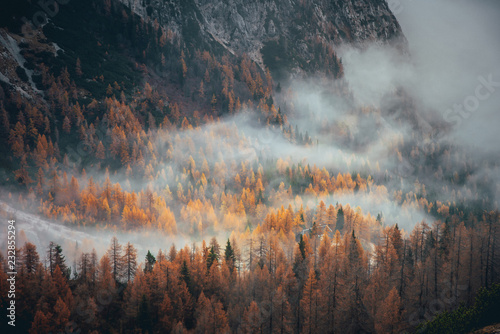 Mist in autumn orange forest. Alps mountains