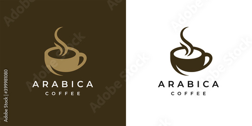 Premium coffee shop logo. Cafe mug icon. Latte aroma symbol. Espresso hot drink cup sign. Arabica cappuccino emblem. Vector illustration.