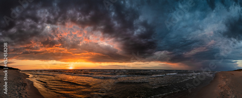 panorama wybrzeża Morza Bałtyckiego wieczorem po burzy podczas zachodu słońca na plaży