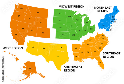 United States, geographic regions, colored political map. Five regions, according to their geographic position on the continent. Common but unofficial way of referring to regions of the United States.