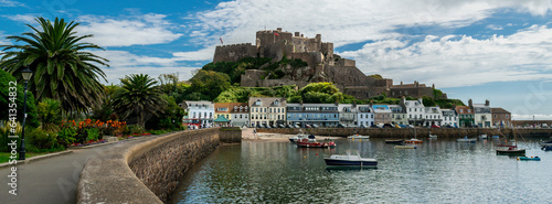 Panoramic image of Mont Orgueil Castle in Gorey on the island of Jersey in the Channel Islands. Fishing boats and colourful buildings with sunshine and blue sky