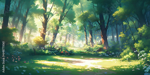 anime cartoon style woodland forest background banner, generated ai