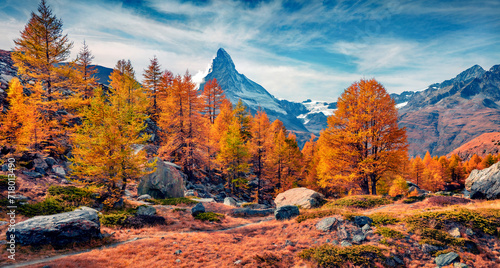 Spectacular morning view of outskirts of Grindjisee lake with Matterhorn (Cervino) peak on background. Stunning autumn scene of Swiss Alps, Zermatt resort location, Switzerland, Europe.