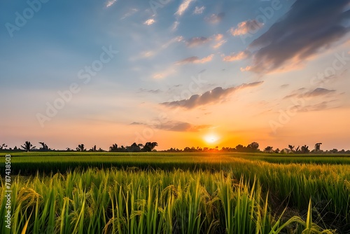 Scenic view of golden rice fields at sunset in the countryside, ready for harvest.
