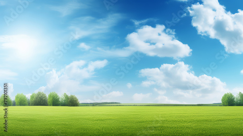 Beautiful spring summer natural landscape. Green meadow grass and trees on blue sky background with sun and clouds on warm sunny day. Colorful bright nature wallpaper with copy space for text.